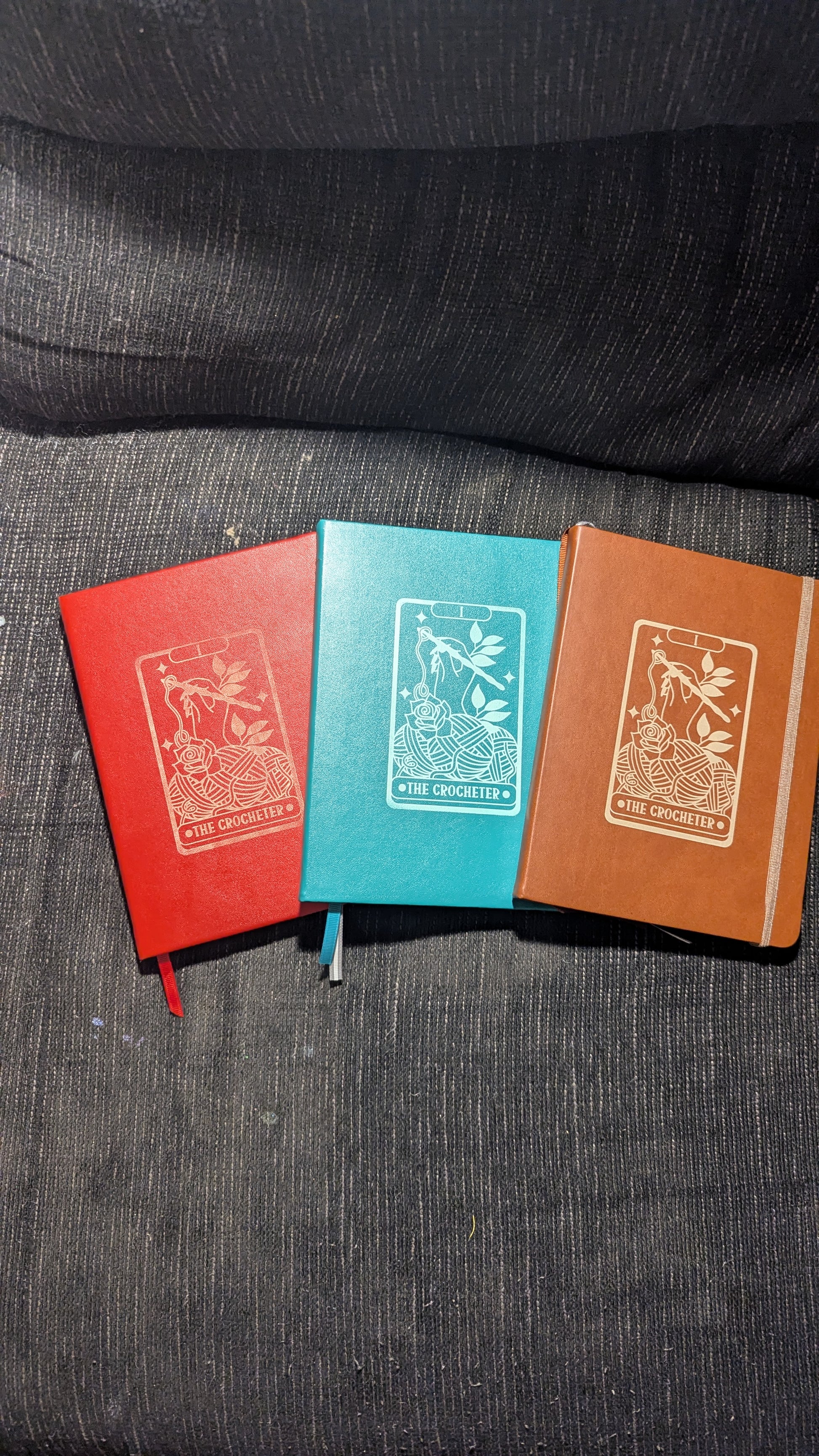 Pick your notebook color and either knitting or crochet to be featured on these exclusive tarot card inspired art work on the cover. The image is etched into the cover so there is no risk of it rubbing or peeling off or fading and cracking with time.