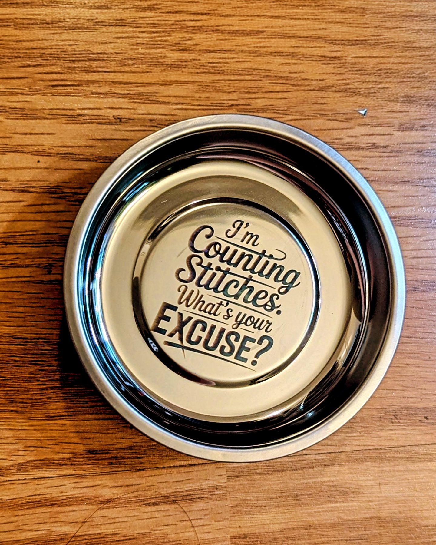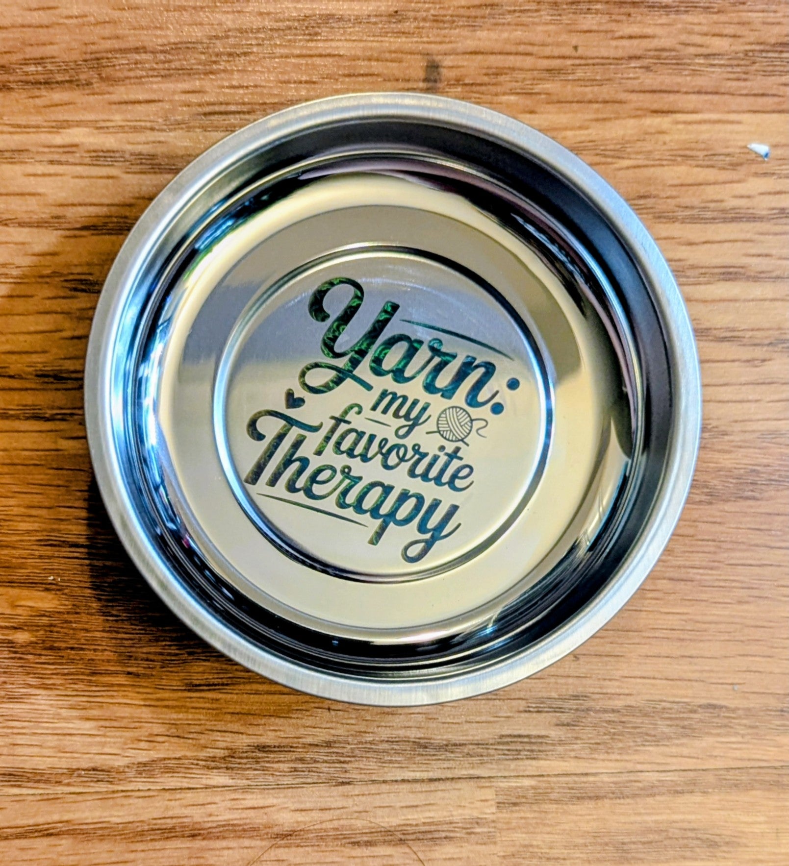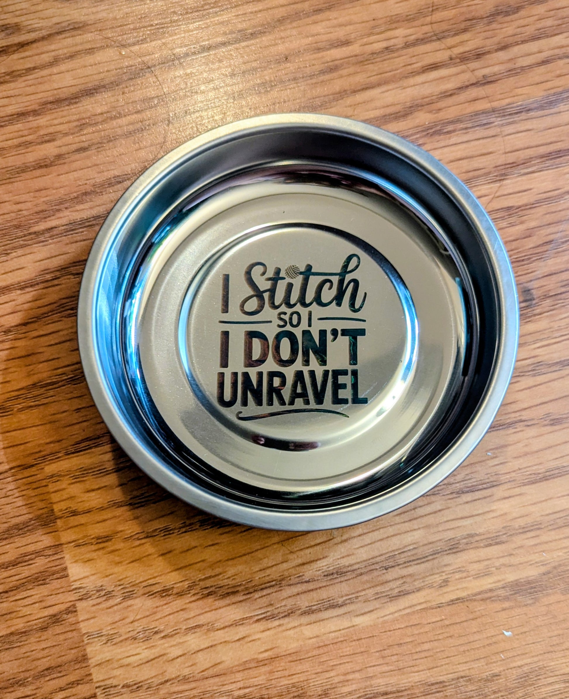 This 4" stainless steel dish features a strong magnet on the underside which holds any metal contents in place. Perfect for holding needles, stitch markers, and even small scissors. Even upside down these items don't fall out.