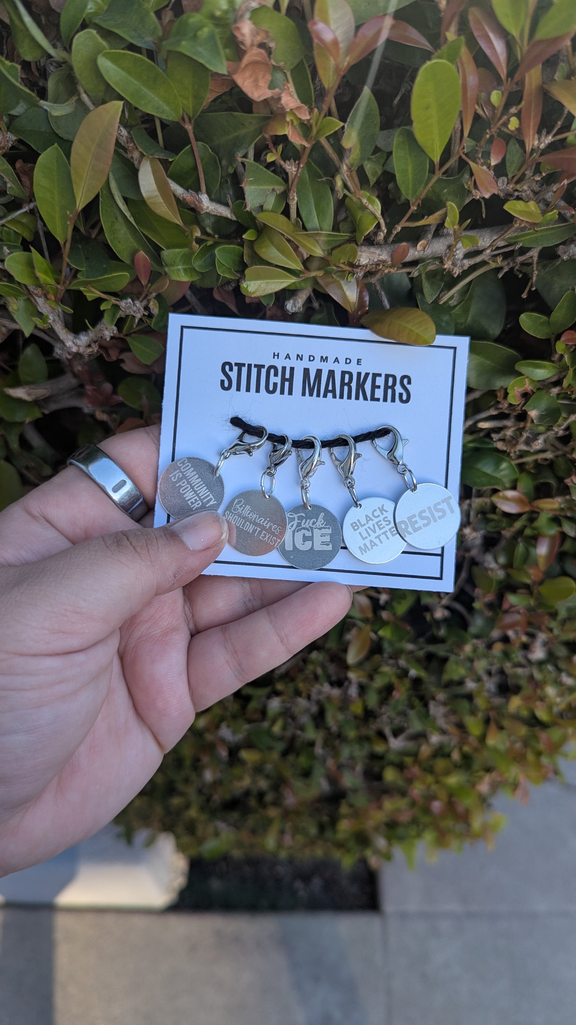 A set of 5 silver stitch markers, each engraved with a battle cry on both sides.